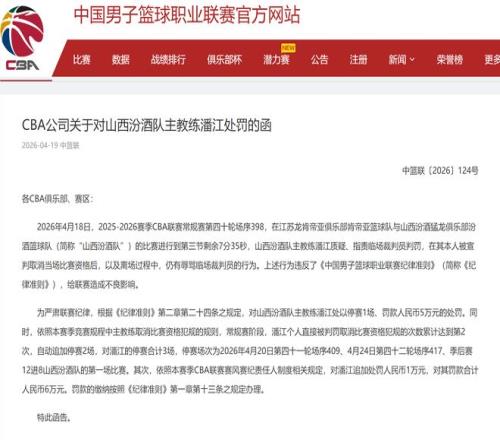 CBA公司給潘江開出了1份大罰單!
