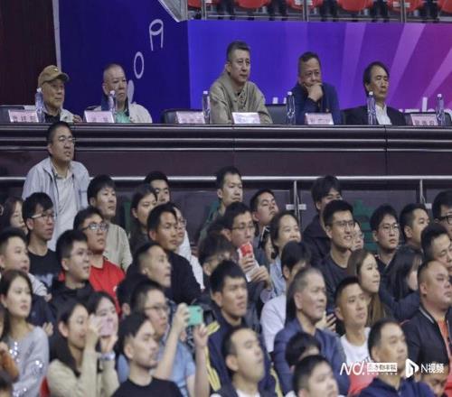 中國男籃主教練郭士強(主席臺左三)在廣州隊看臺上目睹了郭艾倫受傷。南都N視頻 黎湛均攝