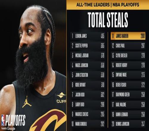 這場比賽還是哈登的里程碑夜晚,哈登季后賽助攻數來到1139次超越隆多升至歷史第七位;哈登本場比賽送出5個搶斷,他超越保羅升至歷史季后賽搶斷榜單第11位。