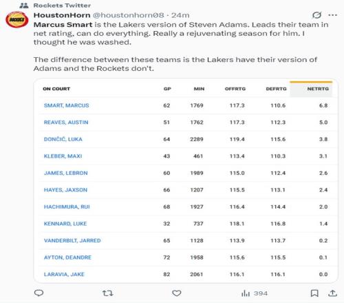 休媒都被他打服了:斯瑪特就是湖人版本的亞當(dāng)斯,他常規(guī)賽凈效率值+6.8是湖人最高的,他在球場上似乎無處不在,我原本以為他就要就此隕落沒想到在LAL煥發(fā)生機(jī),可火箭的亞當(dāng)斯卻因傷無法登場。