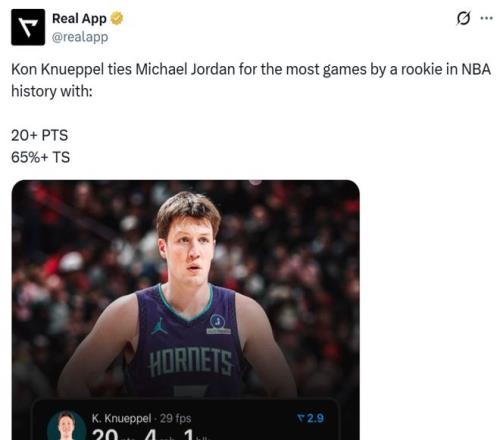 這已經是克努佩爾新秀賽季至今第26場,至少以65%的真實命中率砍下20+得分表現,成功追平喬丹保持的神紀錄,按照克努佩爾的表現與剩余場次他反超喬丹只是時間問題。