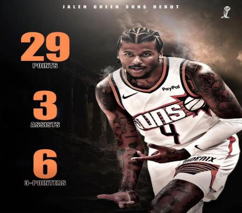 需要說的是,杰倫格林的首秀其實非常驚艷,當時太陽115-102戰勝快船,杰倫格林全場只打了23分鐘時間,投籃20中10,三分13中6,罰球5中3,拿下29分3籃板3助攻2搶斷,正負值高達+30。