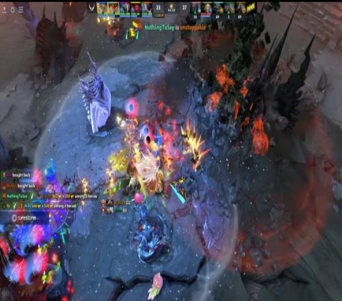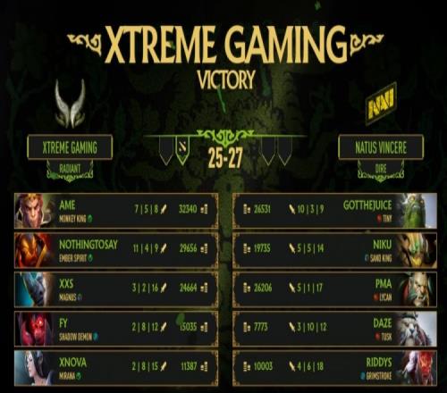 后期XG眾人野區被抓,哥哥大圣開啟bkb擊殺Niku沙王后被換,NAVI打出1換3。NAVI隨后上路推進,哥哥站樁輸出bkb結束換掉Niku沙王,雙方打出2換2,XG經濟劣勢逐漸回到5k。
