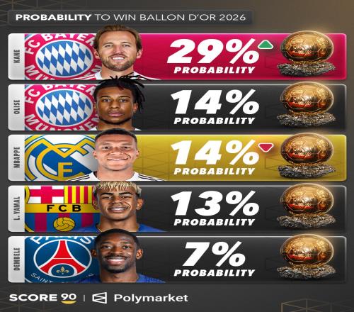 體育播報04月21日宣 Polymarket更新了金球獎得住概率,其中凱恩升至29%,奧利塞與姆巴佩14%并列第二。