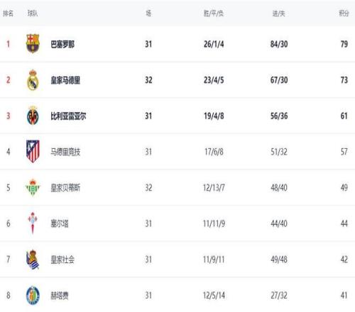 在積分榜上,巴薩占據榜首位置:26勝1平4負,拿到79分。皇馬贏球之后,戰(zhàn)績變成23勝4平5負,拿到73分,排名第2,落后巴薩6分。而且,皇馬比巴薩多踢1場,爭冠前景不容樂觀。比利亞雷亞爾以61分排名第3。第4的是馬競,只拿到57分。皇家貝蒂斯贏球之后,總積分達到49分,排名第5。第6的是塞爾塔,只拿到44分。
