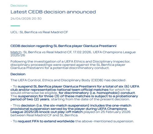 但普雷斯蒂安尼聲稱,自己說的是帶有恐同意味的侮辱性詞匯“maricon”,隨后歐足聯(lián)進行調(diào)查,初步認定普雷斯蒂安尼違反關于歧視性行為的規(guī)定,被臨時停賽1場,缺席了對陣皇馬的次回合比賽。