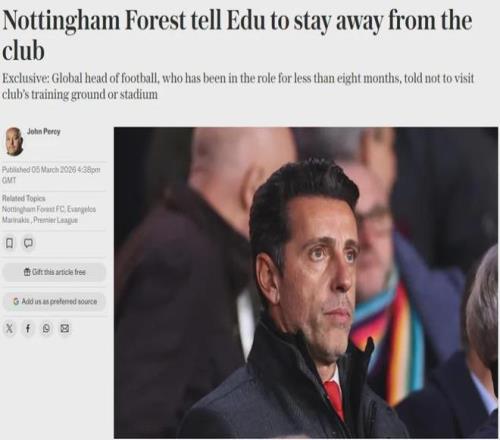 埃杜在森林就職還不到一年,但據悉這家俱樂部目前已經禁止埃杜踏上他們的訓練場和球場。諾丁漢森林去年接近砸下2億英鎊,但本賽季他們已經4次換帥,且成績不佳。