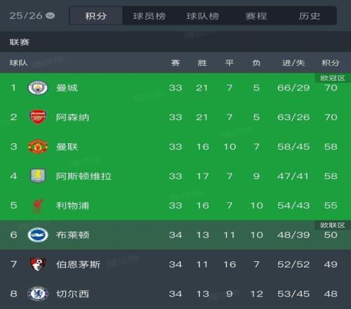 目前,曼城與阿森納戰(zhàn)績(jī)均為33場(chǎng)21勝7平5負(fù),且凈勝球均為+27球。兩隊(duì)比較進(jìn)球數(shù),曼城以66球領(lǐng)先阿森納3球,根據(jù)英超排名規(guī)則曼城將暫時(shí)登頂。