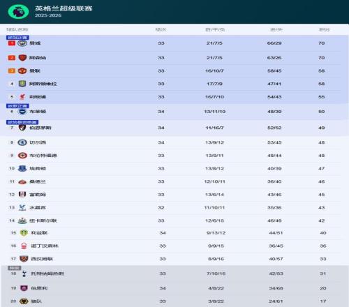 這場勝利也正式改寫了英超積分榜的排名。在曼城比賽結束后,英超官方積分榜更新,曼城與阿森納同積70分,凈勝球也完全相同。在比較第三個關鍵指標——總進球數時,曼城的66球對阿森納的63球占據了3球的優勢。因此,曼城憑借這3個進球的微弱優勢,成功反超阿森納,登上了英超積分榜的榜首。