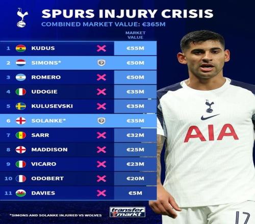 隨著索蘭克和西蒙斯的受傷,熱刺目前傷病名單已多達11人。防線有主力門將維卡里奧、隊長中衛羅梅羅、本·戴維斯和左后衛烏多吉,中前場有薩爾、麥迪遜、西蒙斯、庫魯舍夫斯基、奧多貝爾、庫杜斯和索蘭克。其中羅梅羅、本·戴維斯、西蒙斯、庫魯舍夫斯基、奧多貝爾、庫杜斯6人已確定本賽季報銷,維卡里奧、烏多吉大概率在本周末客戰阿斯頓維拉時能復出,麥迪遜、索蘭克、薩爾有望趕上之后的保級關鍵比賽。
