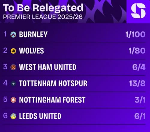 本賽季英超降級賠率排名:伯恩利居首,狼隊(duì)次席,熱刺第四