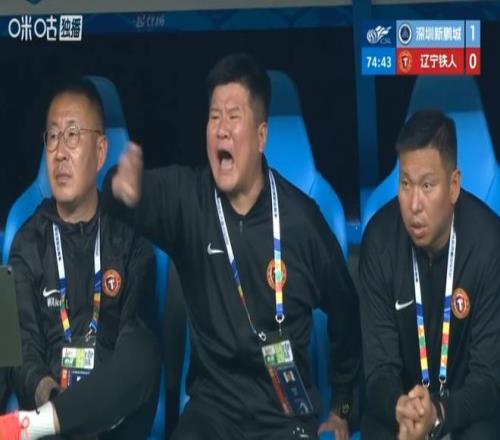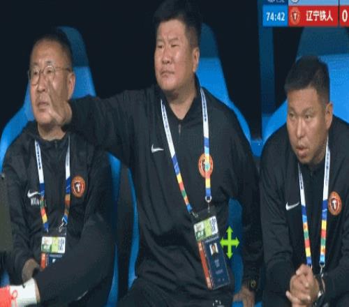 第74分鐘時,也不知道場上的球員發生了什么事,直播鏡頭一轉,聚集到了遼寧鐵人隊的替補席上。只見李金羽正揮手指揮著場上的球員,似乎在要求球隊壓上。李金羽邊揮手,還漲紅了臉大聲喊著什么,說完別過頭來一頓埋怨著啥(下圖)。好玩,看出來李金羽是真的急了,愁得不得了!