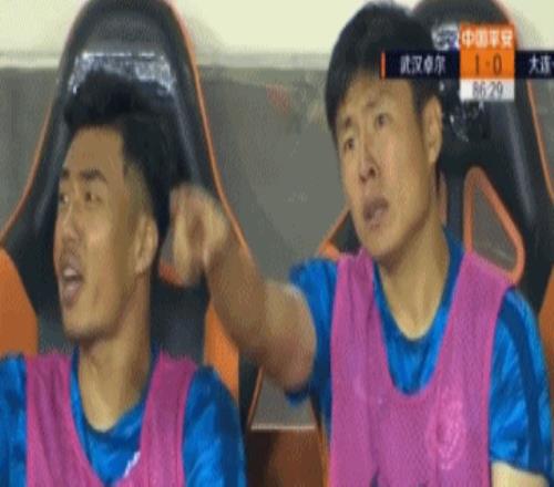 李金羽這個表情包,讓人想起了當年鄭龍+趙旭日版表情包(下圖)。都是坐在替補席對場上球員表現不滿,只不過鄭龍的表情更加夸張和激烈。